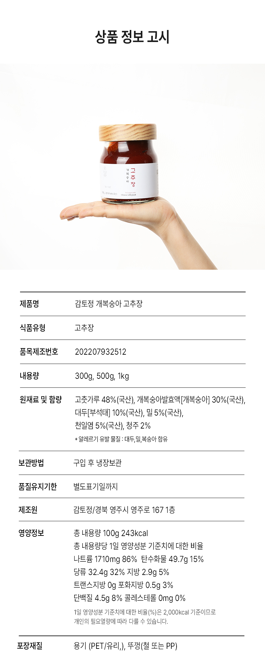 > 감토정 개복숭아 약고추장 500g 비빔밥 양념 맛있는 국산 태양초 재래식 수제 저염고추장 [원산지:국산(경상북도 영주시)]